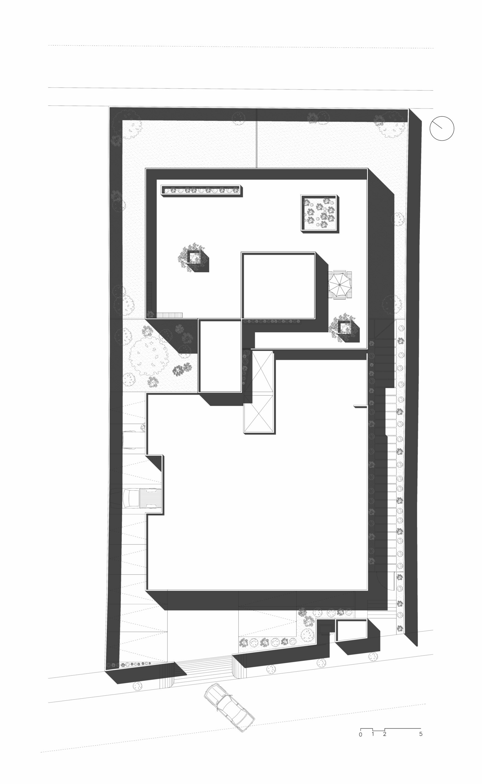 La primera es la fachada, la cual responde de manera distinta en sus cuatro lados. Dos de ellos hacen frente a dos calles (frontal y posterior), por lo cual las fachadas se enfrentan con ventanas piso techo detrás de un generoso balcón corrido para reconocer a las calles y su jerarquía en el contexto. Otra colinda parcialmente con un lote vacío y una vivienda de una planta, la cual responde con una fachada que genera retranqueos en todo su largo y crea partición del bloque en tres volúmenes, uno de ellos abalconado hacia la vista para aprovechar los vacíos urbanos y la baja altura de edificación de la casa vecina. Y la cuarta fachada da hacia una típica casa suburbana con aire campestre, enclaustrada en su cerramiento y con poco valor arquitectónico. Debido a esto, la fachada se desarrolla de manera lineal y plana y sus aperturas son las estrictamente necesarias.