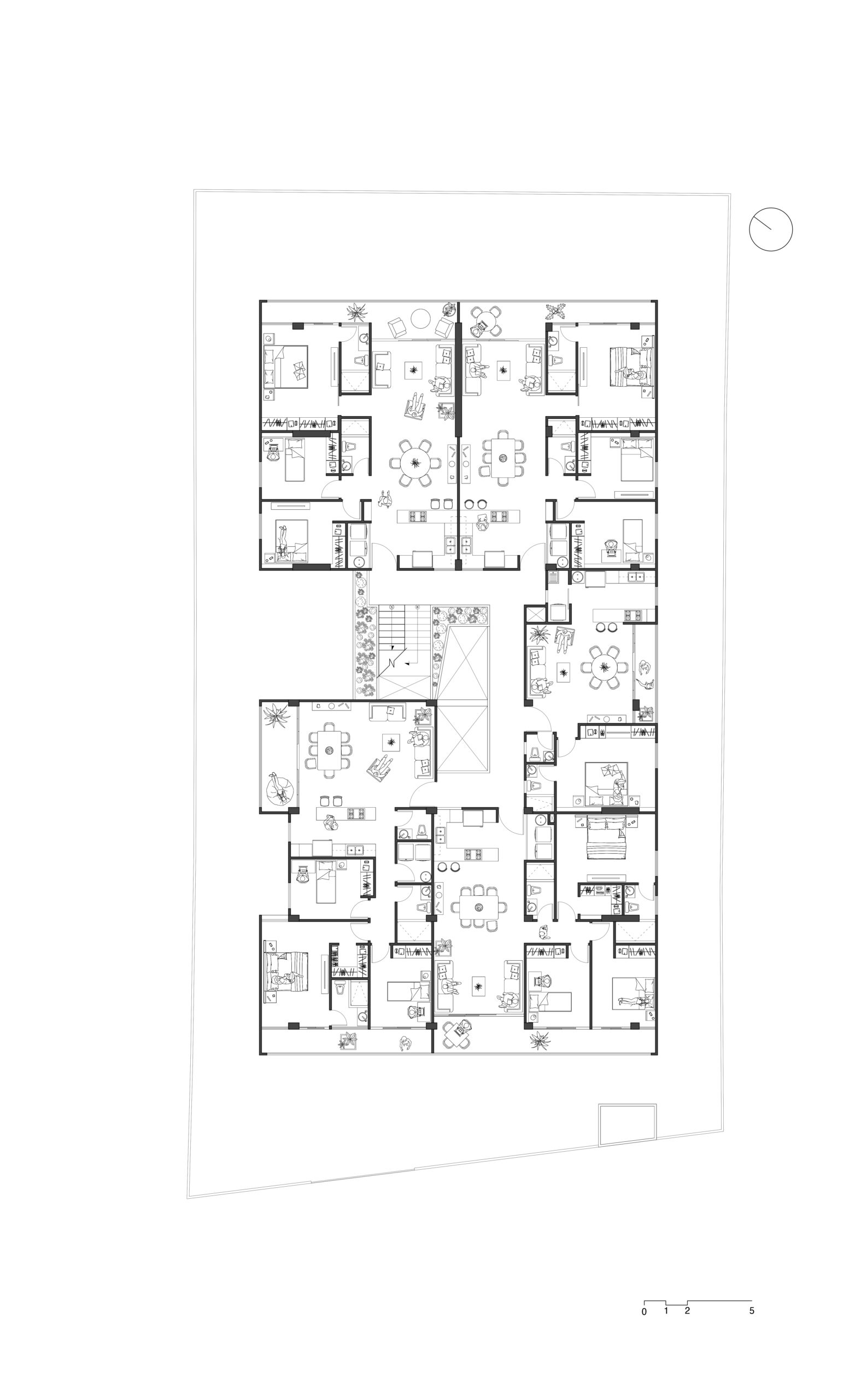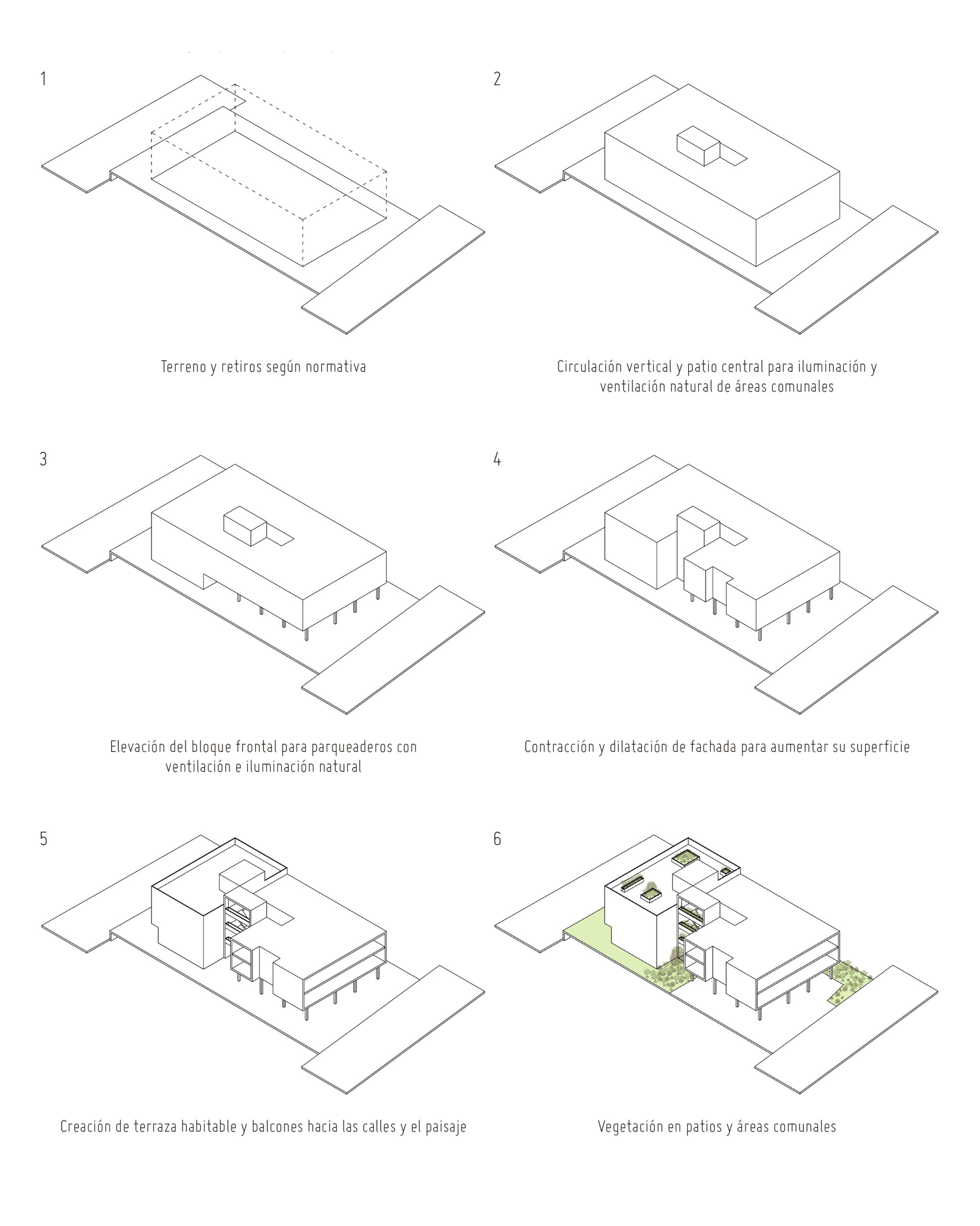 La siguiente es la tipología, ya que si bien su condición aislada nos brinda la posibilidad de tener cuatro caras, también nos quita la opción de generar una fachada continua en el contexto. Debido a esto, el proyecto introduce un patio central semi abierto que permite a la fachada entrar literalmente en el edificio, genera continuidad en sí mismo y maximiza la superficie de fachada para iluminación y ventilación de las viviendas. Además, el patio tiene una triple altura, el cual permite iluminar y ventilar las circulaciones comunales e incluso el parqueadero cubierto que se ubica en la planta baja del edificio.